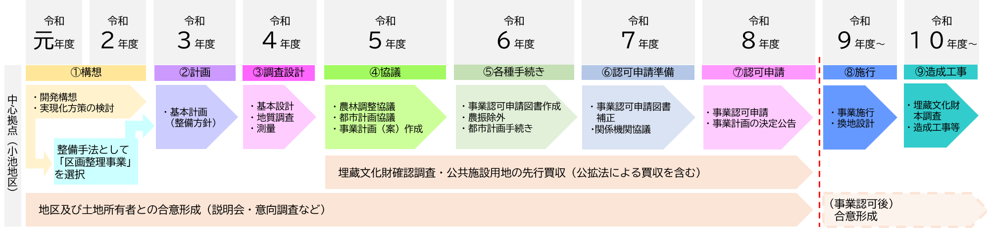 (⇒年度末の認可申請に向けて、千葉県との事前協議及び換地設計の準備を行います。)