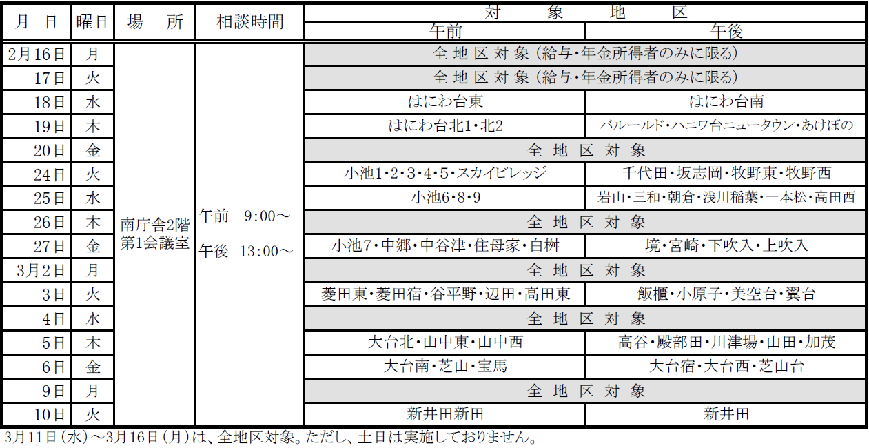 例年、申告期限が迫りますと申告相談会場が大変混雑しますので、下記日程により申告されますようお願いします。なお、対象地区以外の日に申告される場合は、対象地区の方が優先となりますのでご了承ください。 また、申告書の提出のみの方は町民税務課窓口で受付できます。