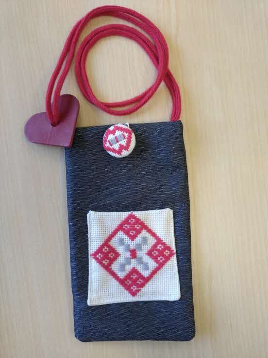好きな色の糸を選んで、こぎん刺しのくるみボタン付きスマホケースを作ってみましょう。