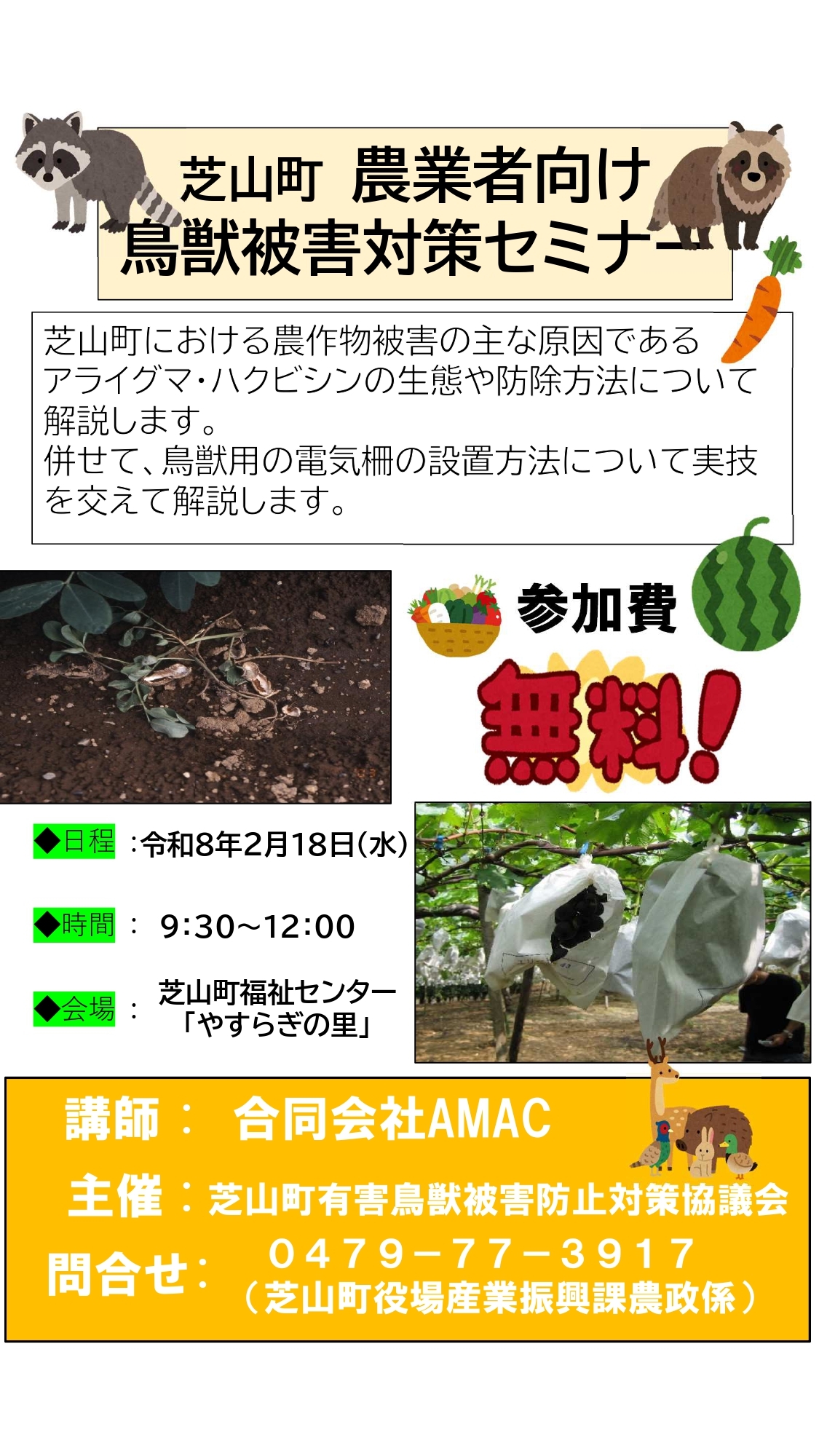 芝山町における農作物被害の主な原因であるアライグマ・ハクビシンの生態や防除方法について解説を行います。併せて、鳥獣用の電気柵の設置方法について実技を交えて解説します。大切な農作物を鳥獣から守るためにも、ぜひご参加ください。