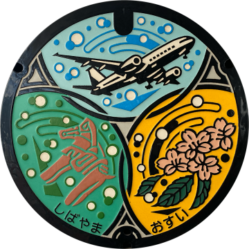 空港を飛び立つ飛行機、馬のはにわ、山桜をテーマにバックを虹のシャボン玉でまとめ、科学と伝統が交差する夢ある芝山町をイメージしたマンホールです。
